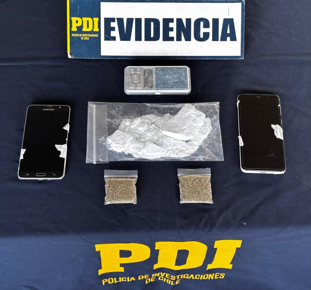 En el lugar, los detectives detuvieron a una mujer chilena, mayor de edad, sin antecedentes policiales de detención ni encargos judiciales vigentes, e incautaron 91,10 gramos de una sustancia dubitada como clorhidrato de cocaína y 11,41 gramos de una sustancia presumiblemente cannabis, además de elementos utilizados para la dosificación de droga y dos equipos telefónicos móviles.