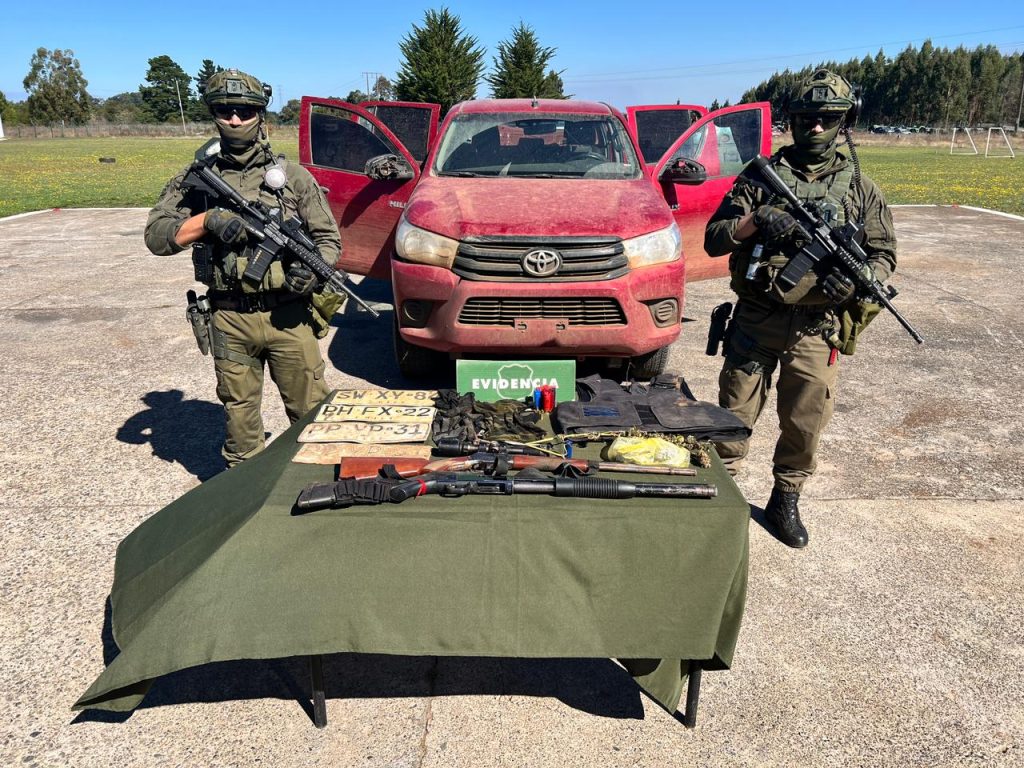Gracias al trabajo de Carabineros COP, se recuperaron además diversas placas patentes de vehículos con encargo por robo, una escopeta y un rifle con mira, así como cannabis sativa y diversos cartuchos de escopeta. También se encontró un chaleco antibalas, ropa militarizada y guantes.