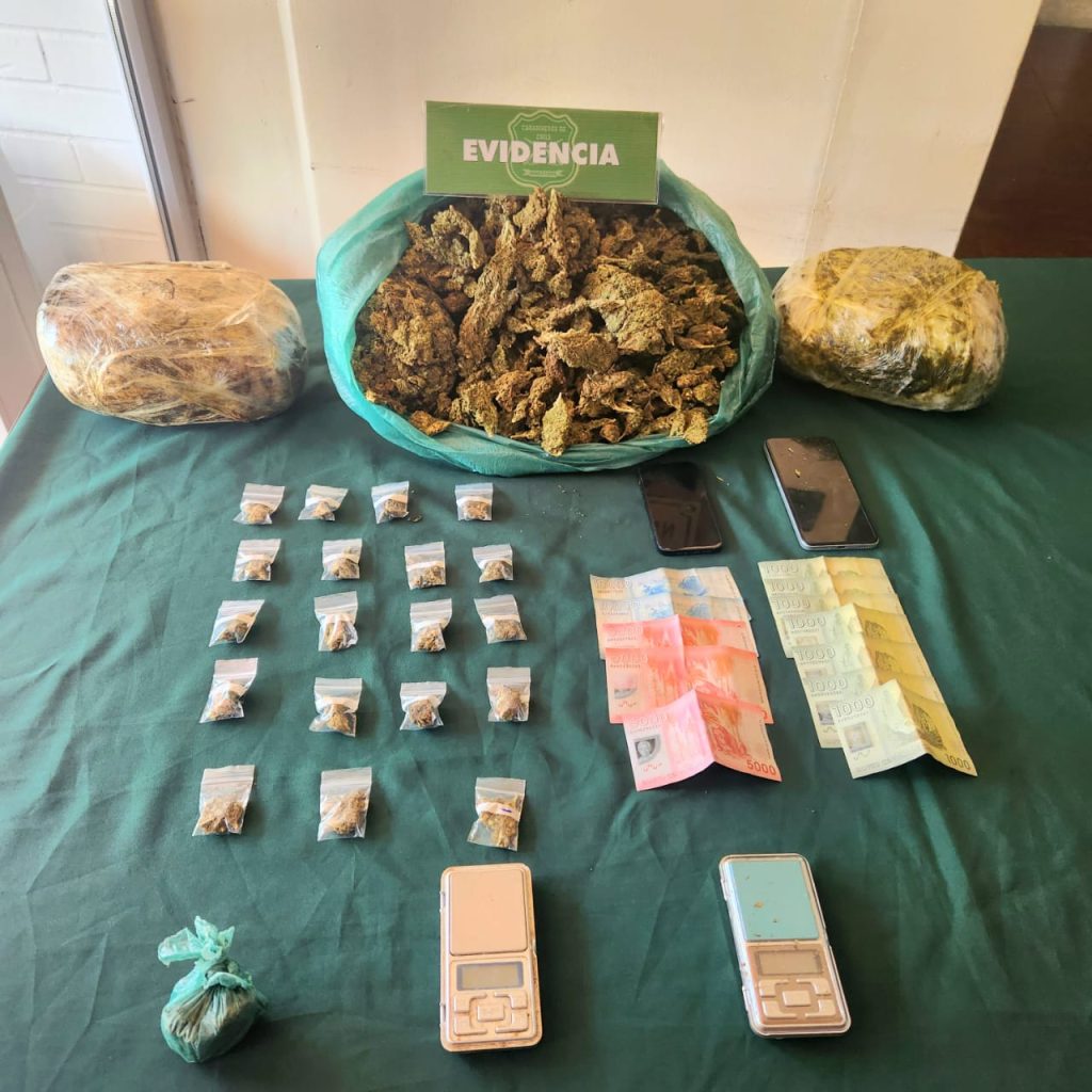 Es en ese contexto que la sección especializada logró determinar que el sujeto mantenía en su domicilio ubicado en el sector San Andrés de la capital de La Araucanía 4 kilos 431 gramos de marihuana elaborada, además de elementos ligados al tráfico de drogas tales como pesas digitales, bolsas contenedoras pequeñas de plástico, dinero en efectivo y teléfono celulares.