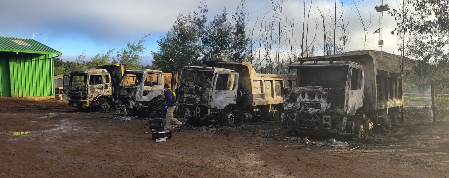 Detectives de la Brigada de Investigaciones Policiales Especiales y Antisecuestro Angol, BIPE, junto al Laboratorio de Criminalística Regional Cobertura Sur Temuco, desarrollan diligencias investigativas para el esclarecimiento del delito de atentado incendiario que afectó instalaciones de un vertedero, ubicado en el kilómetro 7 de la ruta R-182, comuna de Collipulli.